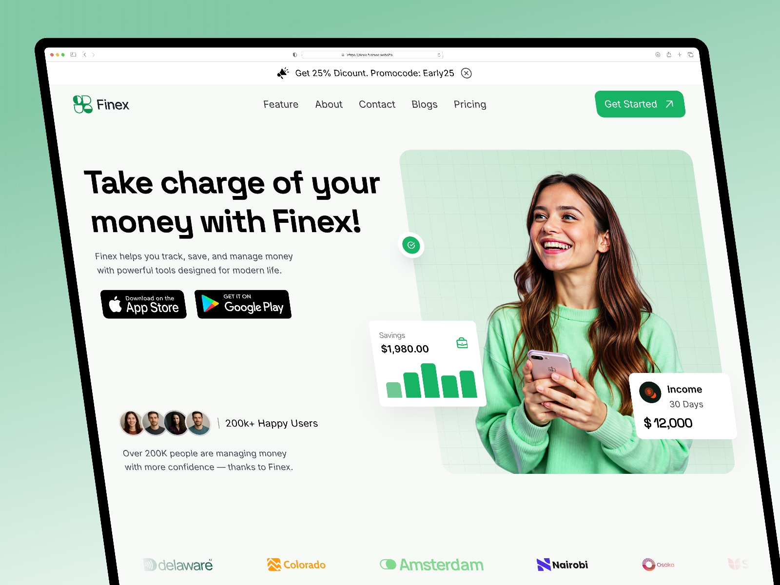 Finex is a sleek, conversion-focused Framer template for finance apps and fintech startups. Showcase your product, highlight features, and build user trust with a professional, responsive, and user-friendly design—perfect for launching money management apps.