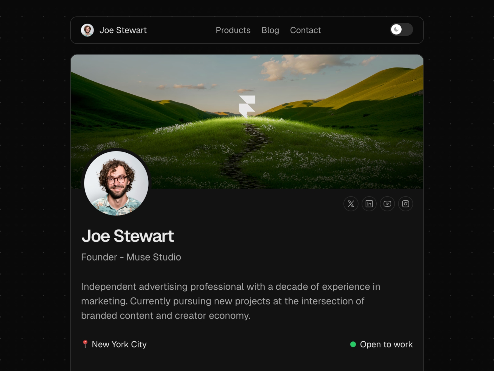 Profile Bio & Status: Display your profile, tagline, and current status (e.g.: 'Open for work' or 'Launching soon').