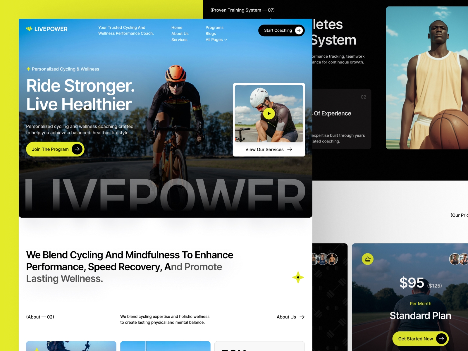 Livepower is a bold Framer template built for wellness coaches, fitness professionals, trainers, and cycling-focused businesses. Its strong visual style highlights coaching programs, cycling training, brand values, and high-impact courses content.