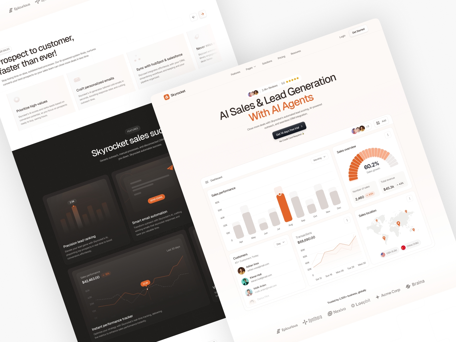 Dashboard Hero & Trust Signals – Hero section with headline, call to action, live dashboard metrics and client logos.