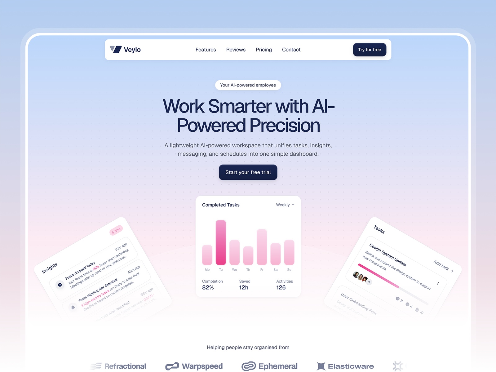Veylo is a productivity SaaS template for startups and teams, featuring editable illustrations, reusable components, and ready-made pages like pricing, contact, and CMS to help you build and launch faster.