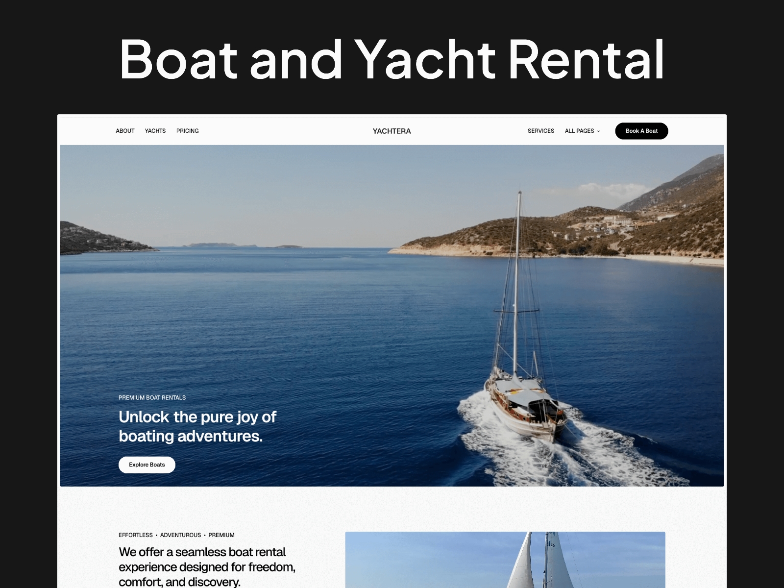 Yachtera is a modern Boat Rental and Yacht Rental Framer Template created to help charter companies, rental providers, and marine service businesses build a strong and trustworthy online presence. Whether you focus on Boat Rental services, offer premium Yacht Rental experiences, manage Private Charters, or provide guided on-water tours, Yachtera gives you a professional foundation to showcase your fleet and promote unforgettable voyages.